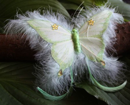 Vlinder van veren in groene kleuren versierd met glitter stenen. De vlinder is circa 20 cm breed en 15 cm lang en staat op een ijzeren pin van circa 9,5 cm.