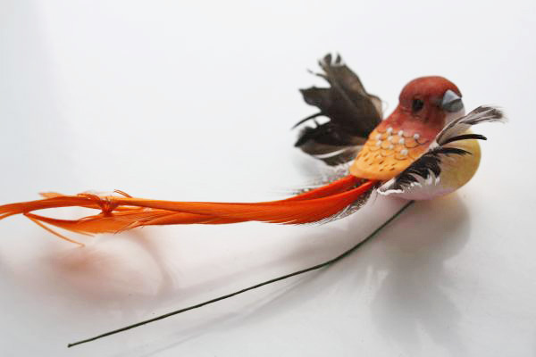 Vogel van schuim en veren. De vogels zijn circa 15 cm lang, 8 cm breed en 4 cm hoog. De vogels staan op een ijzeren pin van circa 10 cm.