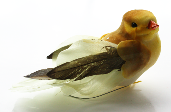Vogel van veren en schuim.De vogel is ongeveer 9 cm lang en 4 cm hoog.