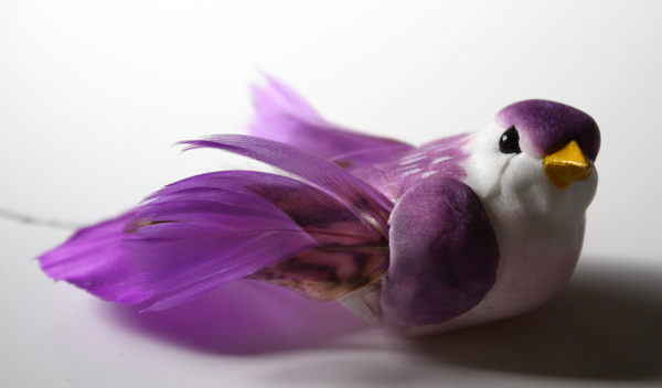 Veren vogel van ongeveer 3,5 cm hoog en 9 cm lang. De vleugeltjes staan iets open.