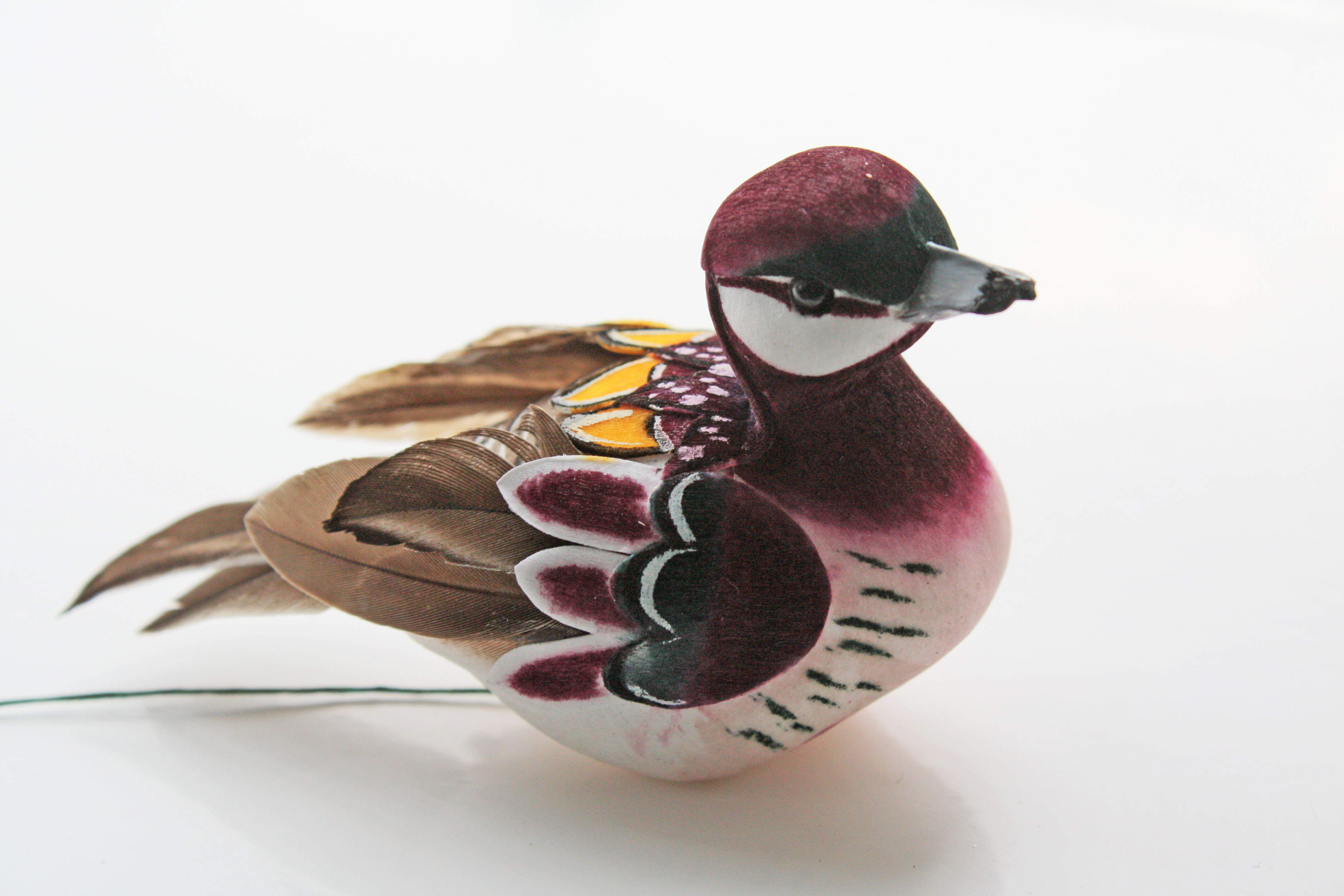 Eendje gemaakt van schuim en veren. Het eendje is circa 9 cm lang, 3 cm breed en 4 cm hoog, en staan op een pin van ongeveer 10 cm lang.