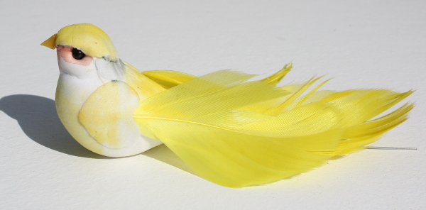 Veren vogel van ongeveer 11 cm lang, 4 cm hoog en 5 cm breed. De vogel staat op een ijzeren pin van ongeveer 8 cm