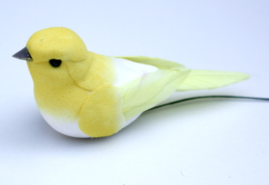 Veren vogel van ongeveer 3.5 cm hoog en 9 cm lang. De vogel staat op ijzeren pin.