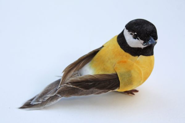 Veren vogel van ongeveer 5 cm hoog en 9,5 cm lang.
