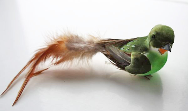 Veren vogel van ongeveer 5 cm hoog en 15 cm lang.