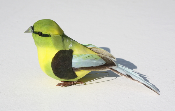 Veren vogel van ongeveer 5 cm hoog en 10 cm lang. De vogel staat op ijzerdraad.