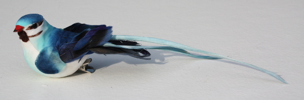 Veren vogel van ongeveer 4,5 cm hoog en 16 cm lang. De vogel staat op ijzeren clip.