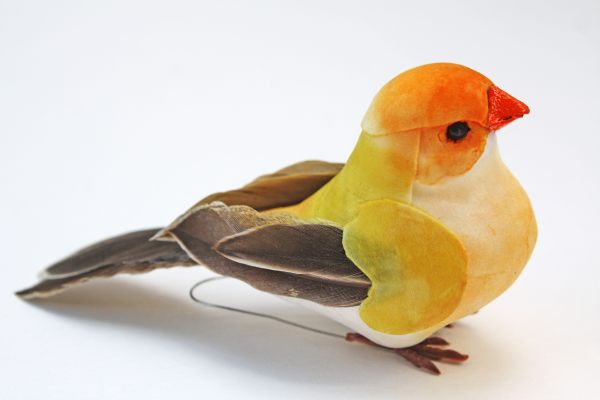 Vogel van veren en schuim. De vogel is circa 8,5 cm lang en 5 cm hoog. De vogel staat op een ijzerdraad.