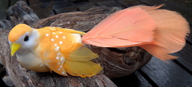 Veren vogel van ongeveer 12.5 cm lang, 5.5 cm breed en 4 cm hoog.De veren vogel staat op een ijzeren clip.