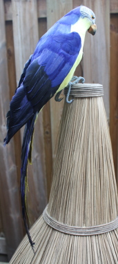 Veren vogel papegaai van circa 50 cm lang, 12 cm breed en 13 cm diep.