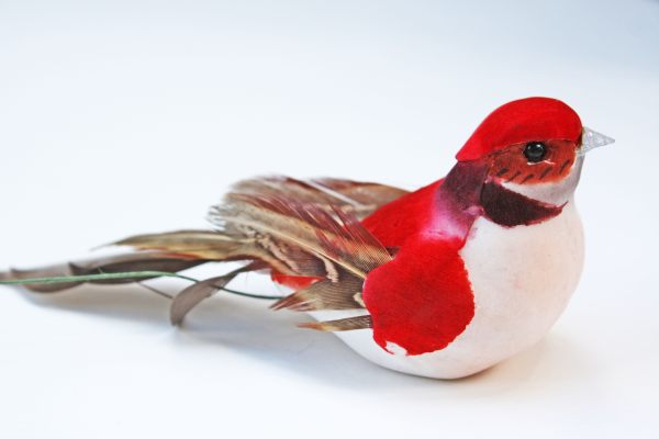 Vogel van veren en schuim. De vogel is circa 12 cm lang en 4,5 cm hoog.