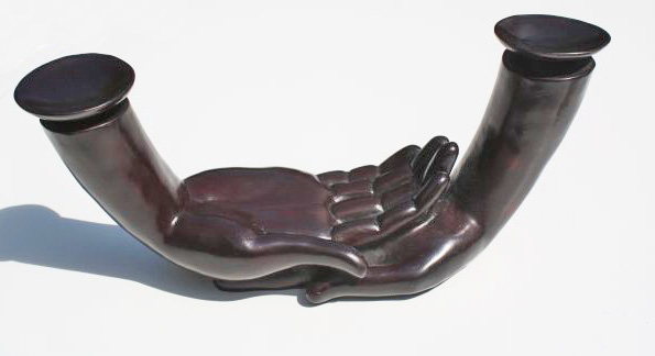 Boeddha handen kandelaar van resin gemaakt. De kandelaar is ongeveer 28 cm breed, 11 cm hoog en 10 diep.