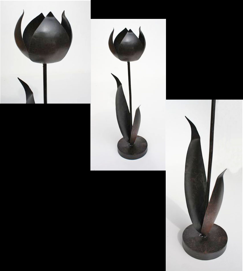 Met de hand gemaakte metalen waxinelicht houder in de vorm van een bloem van 30 cm hoog.