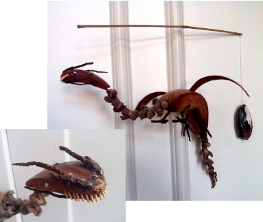 Deze mobiel van een draak is met de hand van kokos, schelp en hout gemaakt.